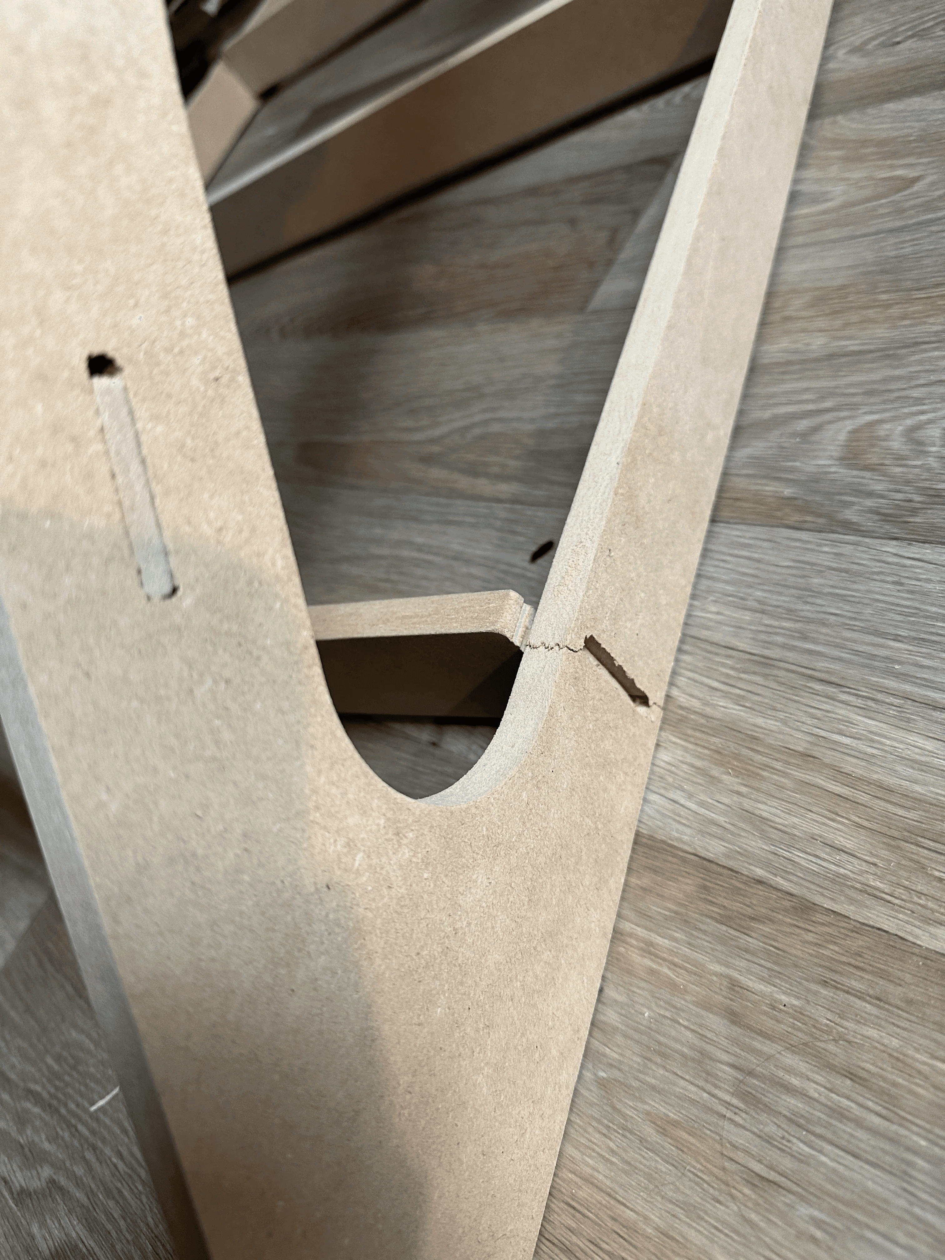 MDF material choice and thickness. There's no grain for MDF so the lack of strength is prevalent. I could have maybe been successful with a 3/4" MDF instead of 1/2" MDF